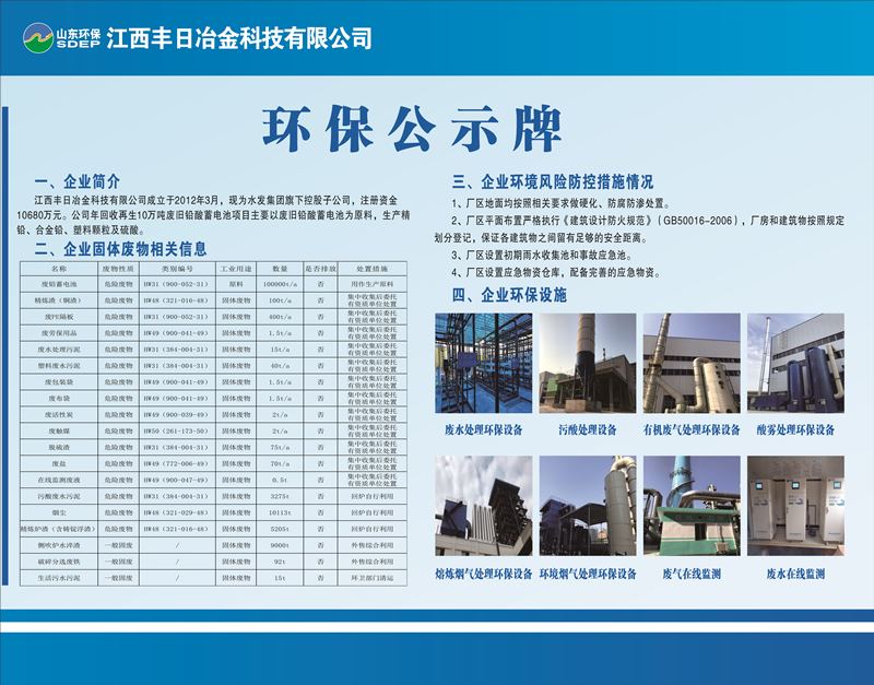 江西豐日冶金科技有限公司江西豐日冶金科技有限公司成立于2012年3月,注冊(cè)資金15000萬(wàn)元,現(xiàn)為山東環(huán)保集團(tuán)旗下控股子公司,落戶于江西省宜春市袁州醫(yī)藥工業(yè)園。公司年回收再生十萬(wàn)噸廢舊鉛酸蓄電池項(xiàng)目占地62.41畝,總建筑面積42180㎡,總投資3.5億元,于2020年5月份投入生產(chǎn),自生產(chǎn)以來(lái)運(yùn)行穩(wěn)定,年產(chǎn)值達(dá)10億元以上,年納稅1億元以上。
